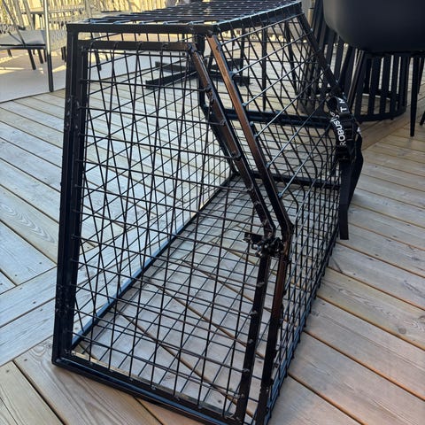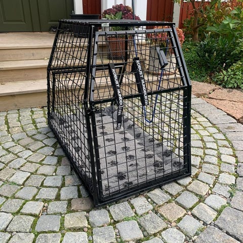 Hundbur i svart metall med gallerkonstruktion från Robust hundburar www.robusthundburar.se . Buren har dörr framtill med låsanordning. Vi snabb affär medföljer en Biabädd. Lämplig för transport eller vila för hund, anpassad för placering i bilens bagageutrymme eller inomhus beroende på mått och behov. Har haft en Golden retriever i buren och buren i en Volvo 940.