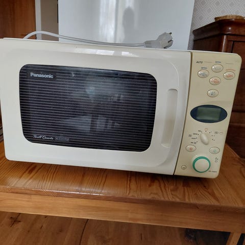Ca 10 år gammal Panasonic mikrovågsugn (NN-E203WB). Utrustad med mekaniska vred för effektläge och timer. Invändigt finns roterande tallrik för jämn uppvärmning av mat och dryck. Passar för uppvärmning, upptining och enklare tillagning i kök, studentbostad eller kontor.