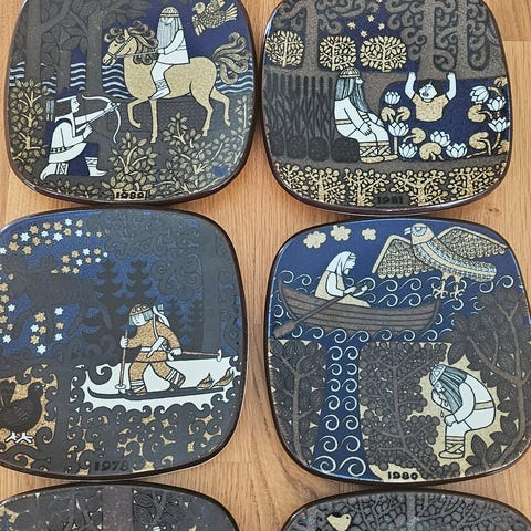 Arabia Kalevala väggtallrikar i porslin med motiv ur Kalevala-serien. Tallrikarna har färgillustrationer på framsidan och upphängningsanordning på baksidan. Lämpliga som samlarobjekt eller väggdekoration i hemmet.