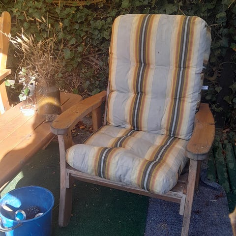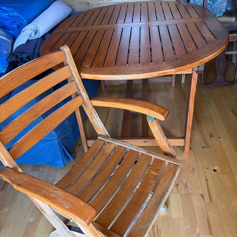 Trädgårdsgrupp från JYSK. Tresitsig soffa och två tillhörande stolar. Materialet är i teak och det tillkommer dynor. I fint skick.