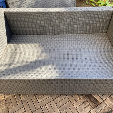 Balkongsoffa i två separata moduler som tillsammans bildar en tvåsitssoffa. Stomme i vitlackerad metall och lösa sitt- och ryggdynor i grått tyg. Soffan är avsedd för utomhusbruk, exempelvis på balkong eller mindre uteplats. Medföljer två avlånga prydnadskuddar i matchande grå nyans. Sitsen är låg och djup, anpassad för avslappnad sittställning.