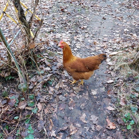 Överlevare av gallringen av tuppar i höstas och överlevare av stormen Dave för några helger sedan, då en stor gran föll över hönsgården och demolerade en del av hönsgården likt en pantburk i en pantmaskin.