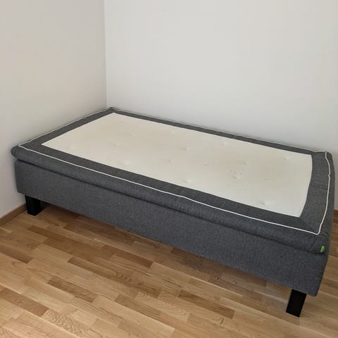 Jysk säng ”90” med resårbotten i grått tyg. Var egentligen menad till en dubbelsäng så är av högre kvalité. Där av har den svart tyg på ena sidan, men roteras enkelt bort mot en vägg om man inte tänkt täcka den helt med överdrag. Enkelsäng med rektangulär form och ben i metall. Överdel i ljust tyg som fungerar som bäddmadrass eller skydd. Passar som vanlig säng i sovrum, gästrum eller tonårsrum.. följer även med en sänggavel.