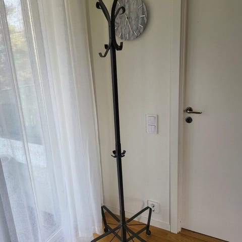 Fristående klädhängare i golvmodell i vitmålat trä. Överdel med flera krokar för upphängning av jackor, väskor och andra plagg. Vitmålad något skavd.