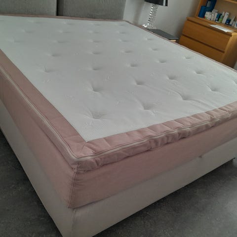 IKEA Tustna bäddmadrass i vit färg. Madrassen är placerad ovanpå en sängram och ger ett extra komfortlager ovanpå den ordinarie madrassen.