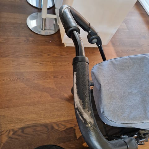 En svart carena resevagn som är andvänd av ett barn , litet hål i korgen där nere men inget som stör , ösn får själv tvätta tyget.