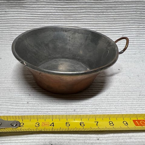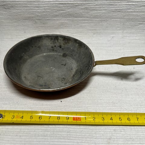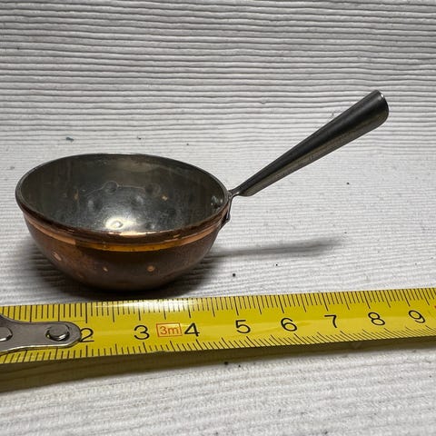 Kastrull med tre ben och handtag. Miniatyr liten oklart ålder mått ca 9 cm inkl handtag höjd 5 cm och inkl handtag 6 cm och ca 40 gram i bra skick