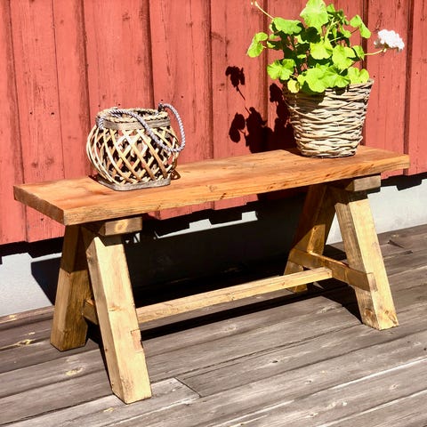 Robust bänk med gamla väderbitna plankor på sitsen. Behandlad med utomhuslasyr.