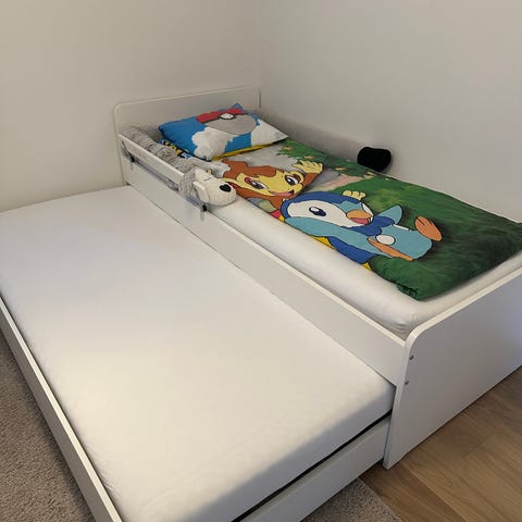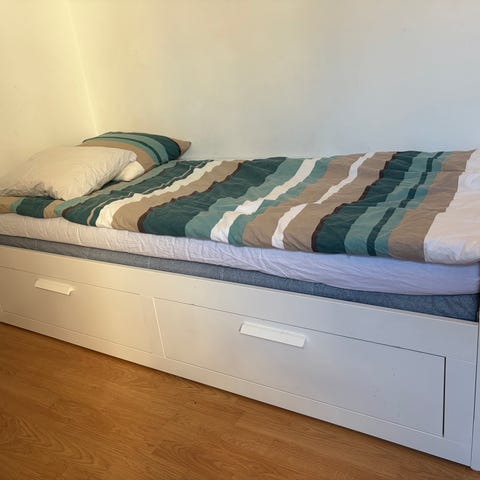 Sängram till madrass 90x200. Två stora förvaringslådor på hjul under.