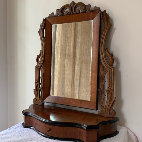 Spegelbord i blankt ädelträ med rektangulär spegel och dekorativ överdel. Spegeln är monterad på en fot med svängd front och inbyggd låda. Träet har en varm brun ton. Passar som toalettbord eller sminkspegel i sovrum eller hall.