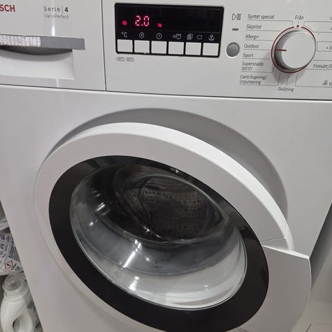 Bosch frontmatad tvättmaskin i vit färg. Modellen är en standardstor maskin med frontlucka och digital display. Maskinen har programväljare med flera tvättprogram och tydlig panel för inställning av temperatur och centrifugering. Passar för installation i badrum eller tvättstuga under bänk eller i kombination med torktumlare ovanpå. Lämlig för normal hushållstvätt av kläder, handdukar och sängkläder.