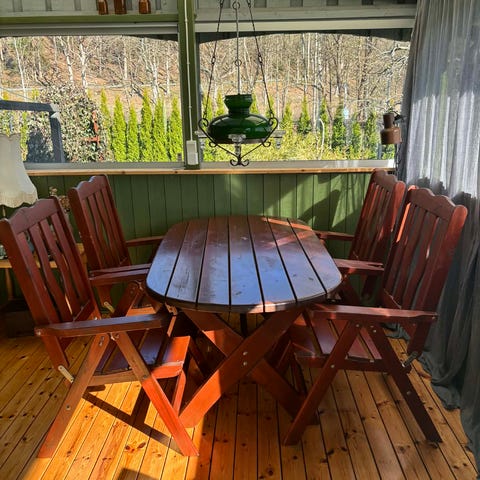 Trädgårdsgrupp bestående av en 3-sits soffa, två fåtöljer och ett rektangulärt bord i trä. Möbelstommen är i ljust trä, furu och kraftiga ben. Dynorna är tjocka med mörk bottenfärg och blommigt mönster. Passar för uteplats, altan eller uterum som sittgrupp för flera personer runt bordet. Bordet har ribbad skiva och rundade hörn. Ryggstödet på stolar och soffa går att variera i tre positioner.