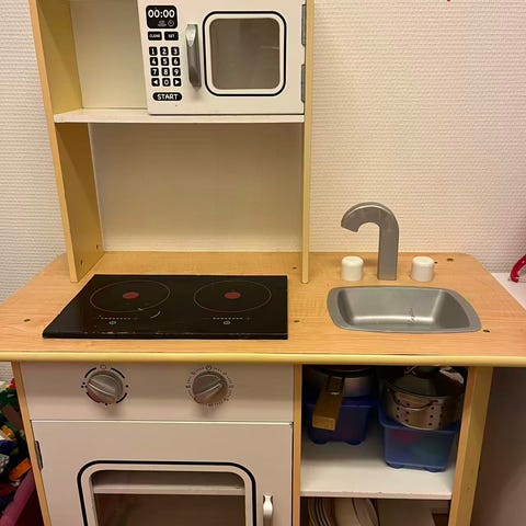 Leksakskök i trä i flerfärgad design med rosa, gult och blått. Köket har kylskåp, ugn, spisplattor, diskho med kran, mikrovågsugn och förvaringsutrymmen. På sidan finns en leksaksklocka.