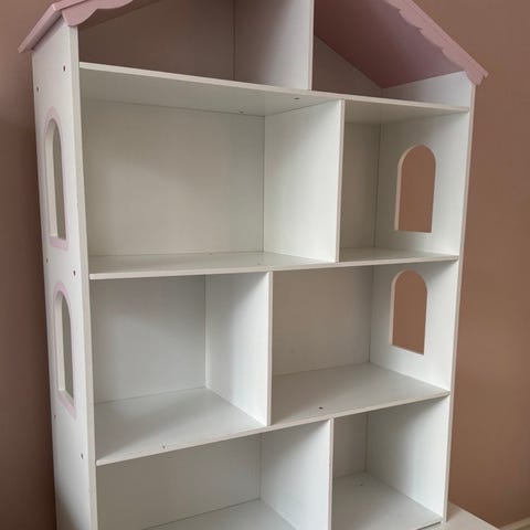 Dockskåp i trä med tre våningar och öppna rum på framsidan. Utsidan är dekorerad i ljusa färger med fönster och detaljerade motiv. Passar för lek med mindre dockor och figurer och kan möbleras efter behov. Stabil konstruktion i trä som kan placeras mot vägg eller fristående.