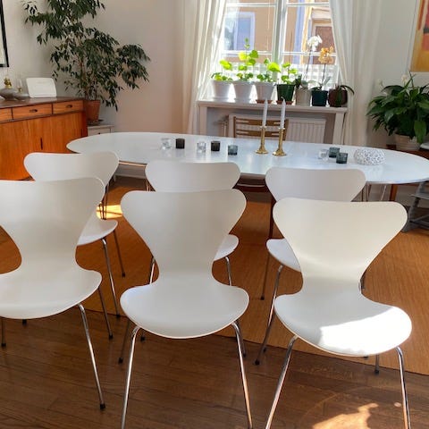 Fritz Hansen Arne Jacobsen matgrupp bord och 6/stolar.