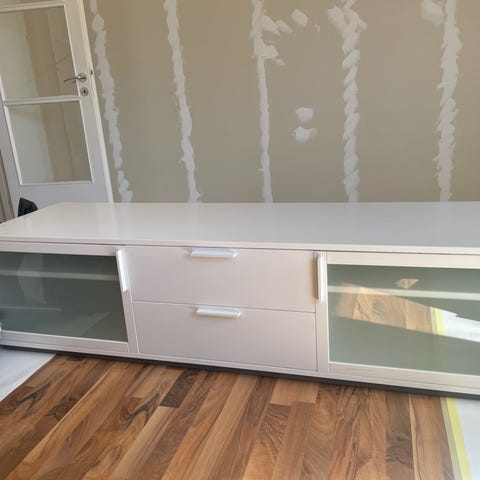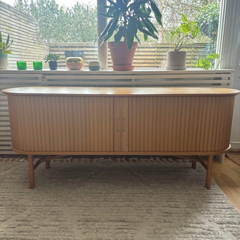 Skandinavisk tv-bänk med gott om plats för praktiskt förvaring. Bakom de två jalusidörrarna döljer sig sex sektioner av fack & tre justerbara hyllplan.