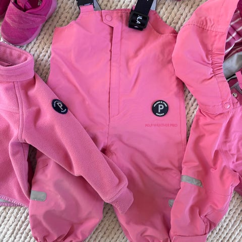 Jacka och fleece storlek 80 och byxor 74 men används samtidigt.