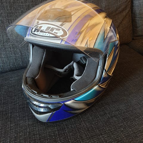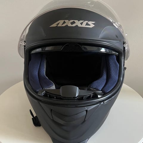 Små märken bak efter att ha ställt upp hjälmen på hylla efter användning/transport. Aldrig tappad i marken eller ramlat med. Fint skick och fräsch.