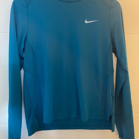 Nike löpartröja långärmad för dam i storlek M. Tröjan är lila och tillverkad i ett lätt, syntetiskt funktionsmaterial som transporterar bort fukt, fri-tech. Modellen har rund halsringning och lång ärm samt reflekterande Nike-logga fram och bak. Passar för löpning och annan träning utomhus eller inomhus.