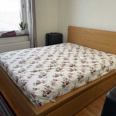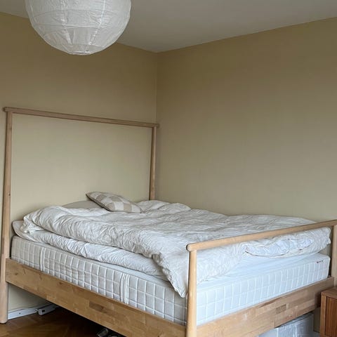 IKEA sängram i trä med inbyggd förvaring i huvudgaveln. Huvudgaveln har öppna hyllor och en utdragbar skiva som kan användas som avlastningsyta, till exempel som sängbord. Sängramen är låg och har en enkel, rak design i träfinish som passar i de flesta sovrum.