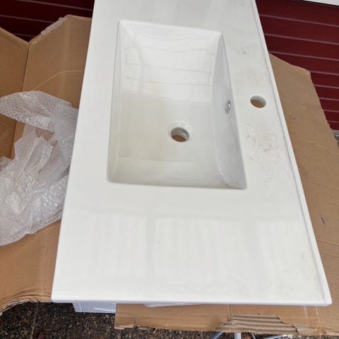 Gustavsberg Graphic 800 tvättställ i vit färg. Rektangulär form med centrerad, rektangulär tvättskål och hål för blandare. Avsett för montering ovanpå kommod eller bänk, bredd cirka 80 cm. Passar för badrum där man önskar ett planmonterat tvättställ med integrerad tvättskål.