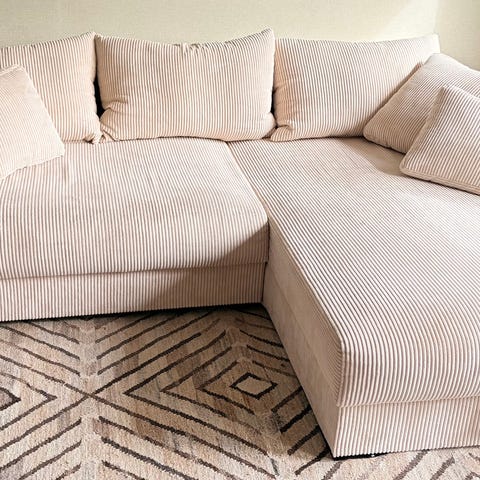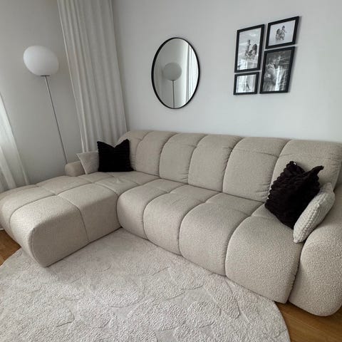 Det är Sweefs bäddsoffa Valrossen med divan till höger. Bouclétyg i färgen benvit som går mot det ljusbeige hållet. Slittålig och superskön. Den dras enkelt ut till en dubbelsäng för 2 (ca 140 cm bred) och har gott om förvaring i divanen.