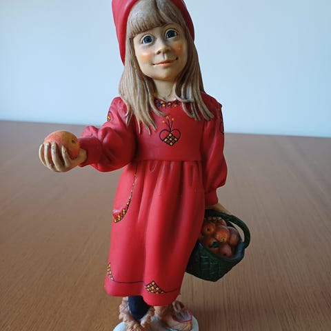 Porslinsfigur föreställande en flicka med blommor. Flickan bär gul klänning och håller en bukett i ena handen samt en korg med blommor i den andra. Figuren är detaljerad med blomhjärta på huvudet och står på en liten fot. Passar som prydnad i hemmet, exempelvis i vardagsrum, hylla eller vitrinskåp.