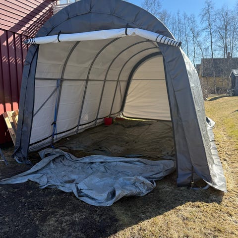 förvaringstält i grå färg. Tältet har duk över tak och sidor samt öppning i gavlarna. Metallstomme med duk som ger skydd mot väder för förvaring av exempelvis utrustning, ved eller trädgårdsredskap. Invändigt finns gott om utrymme för större föremål. Passar som tillfälligt skydd eller lagerutrymme utomhus.