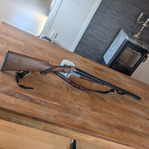 Lätt och trevligt hagelgevär. Kaliber 20 magnum sida/sida med ejektor, 2,5 kg, engelsk kolv 36,7 cm, pipläng 68 cm. Vapnet är så gott som i nyskick, väldigt lite skjuten. Djup bånering på piporna och vacker flamhärdning på baskyl och beslag.