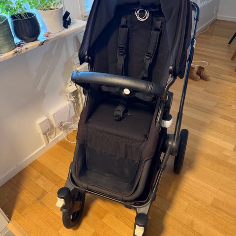 Bugaboo Fox 5 barnvagn i svart utförande. Vagnen har sittdel med fempunktssele och bygel framtill. Justerbart handtag och sufflett med Bugaboo-logotyp. Chassit har fyra hjul och varukorg under sittdelen. Passar för vardagsbruk och promenader med barn.