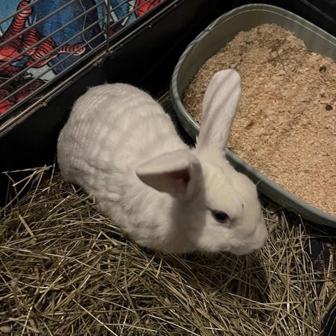 Urgullig kaninpojke på 8 månader. Nyfiken och social. Dvärgvädur och fransk vädur.