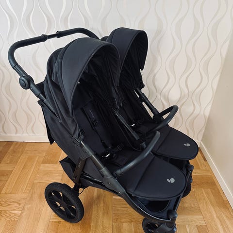 Beemoo syskonvagn dubbel i svart utförande. Vagnen har två separata sittdelar bredvid varandra med individuella ryggstöd, selar och suffletter. Framhjulen är svängbara och bakhjulen är större för stabilitet. Det finns varukorg under vagnen för förvaring. Extra nya bakhjul medföljer. Vagnen passar perfekt för syskon/tvillingar. Åldersrekommendation 0-3 år.