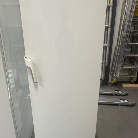 Elektro Helios kylskåp i fullhöjd med flera justerbara hyllplan i metall och glas. Klassisk vit front med vertikalt handtag. Passar som huvudsakligt kylskåp i kök eller som extra kylförvaring i exempelvis förråd eller garage. Invändigt finns hyllor för flexibel förvaring av matvaror och dryck.