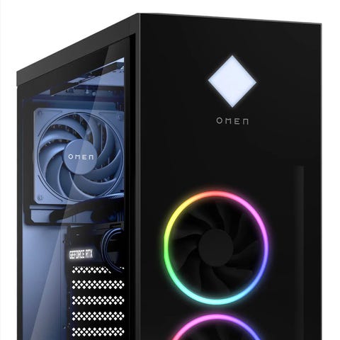 OMEN 45L Gaming DT GT22-1097no PC stationär dator med chassi i svart utförande och sidopanel i glas.