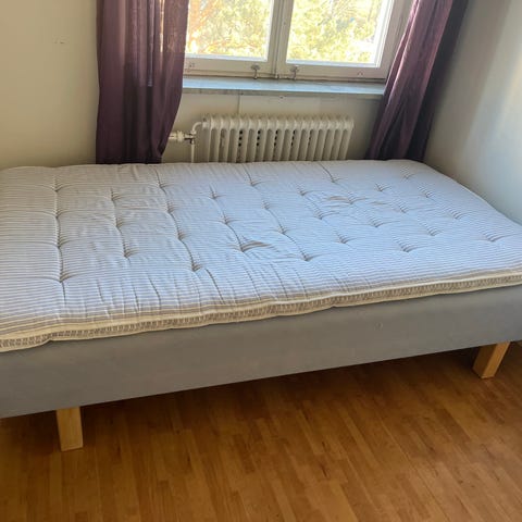 IKEA säng (sultan) i grå färg. Sängen har träram med ben och en grå madrass/toppmadrass. Passar som säng i sovrum eller gästrum. 120 cm.