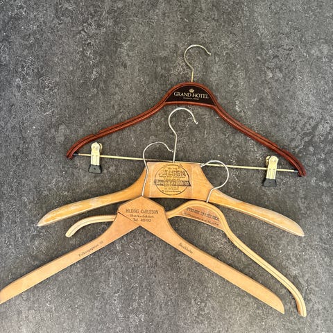 Trägalgar klädhängare i blandade modeller. Flera galgar i trä med metallkrok, vissa med tryck från hotell och butiker. Passar för upphängning av kläder som skjortor, jackor och byxor i garderob eller hall. Flera olika former och färger, främst naturfärgat trä samt en vitmålad galge.