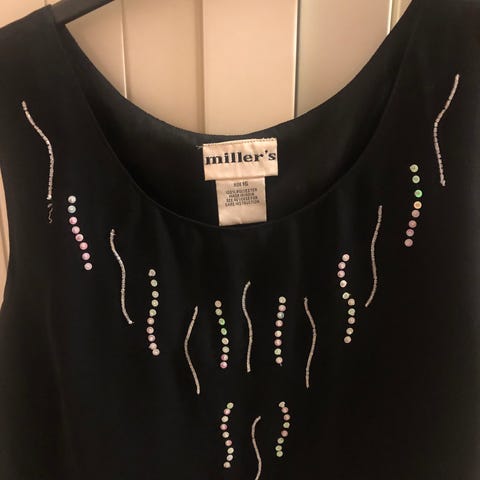 Elegant svart klänning storlek M/40 med axelvaddar och ett vackert utanpåliggande spets med rosmönster. V-ringning, korta ärmar och böljande kjol med inslag av enfärgat svart tyg. Bystmått 96 cm och hel längd 125 cm. Tyngd i tyget så den faller otroligt snyggt. Nyskick
