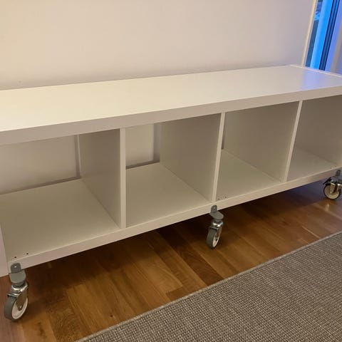 Hylla på låsbara hjul. Grå färg och plywoodkanter. Vet inte vilket märke det är tyvärr. Överlag väldigt bra skick med någon mindre skavank man inte tänker på.