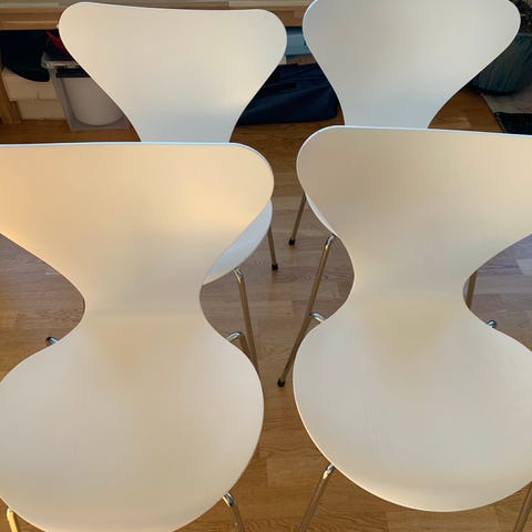 Snygga design stolar av Arne Jacobsen, modell Sjuan. Alla stolarna är original och har stadiga ryggar. Fina i färgen men alla har tunna färgsprickor på stolsitsarna som lätt döljs med en dyna. Säljer alla stolarna för totalt 11 400kr