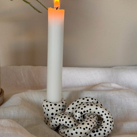 Formen är busig och lekfull. Ljusstaken är handmålad i cremevit med svarta bollar.