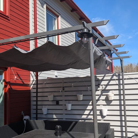 Markis i randigt tyg, lämplig som terrassmarkis över altan eller balkong. Klassisk kassettdesign med utfällbart tyg som ger skugga framför fönster eller dörrparti. Passar för montering på fasad ovanför uteplats eller liknande yta.