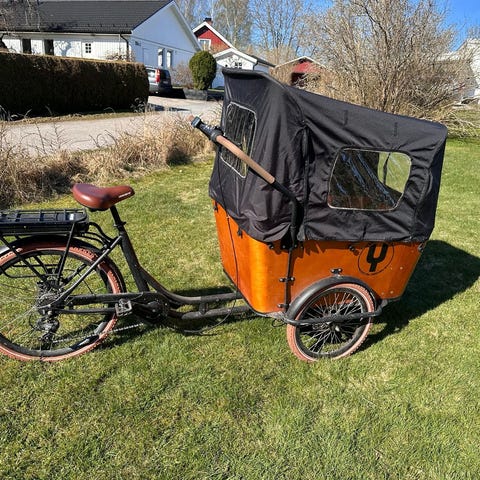 Säljer en klassisk Christiania lådcykel med elassistans i mycket fint skick. Perfekt för barn, handling eller som smidig ersättning till bil i vardagen.