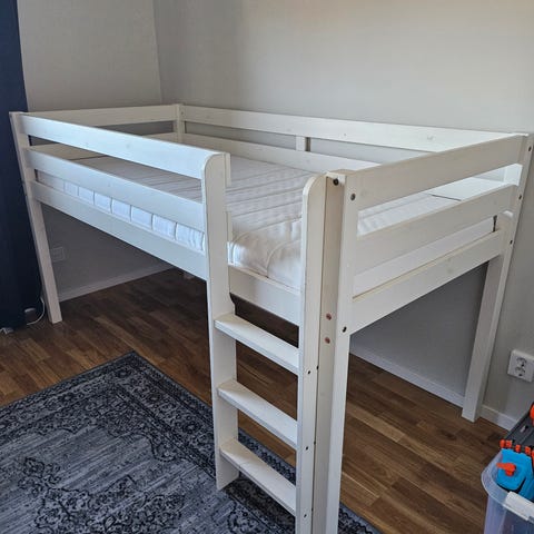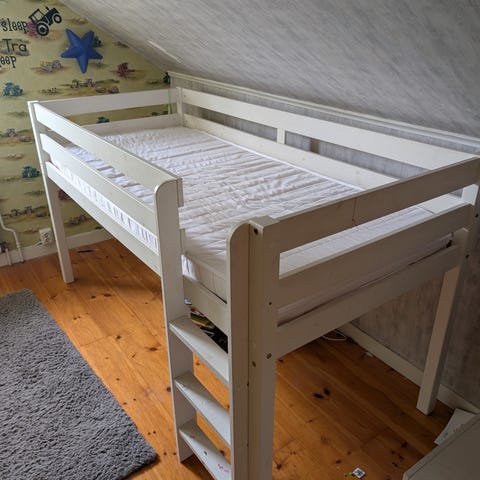 Säljer en praktisk och platsbesparande loftsäng med bäddsoffa som enkelt kan fällas ut till en större säng. Perfekt för barnrum, tonårsrum eller mindre lägenheter.