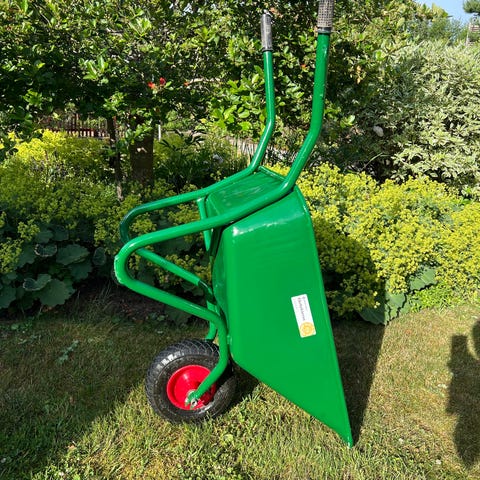 Lescha ZAK 1802 de Luxe kompostkvarn i grön metall med eldrift. Maskinen är avsedd för flisning av grenar och trädgårdsavfall. Den står på stativ med två hjul för enklare förflyttning och har matningsöppning upptill med inbyggda knivar. På typskylten framgår att den är gjord i Västtyskland och har elsäkerhetsmärkningar samt varningssymboler för skyddsutrustning vid användning. Lämplig för trädgårdsarbete och kompostering av mindre grenar och kvistar.