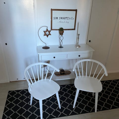 4 stycken stolar. En äldre blå, en vit mindre stol samt två vita stolar. Olika pris för olika stolar.