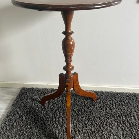 Piedestal i brunt trä med rund toppskiva och svarvad mittpelare med en stabil fot. Passar för exempelvis krukväxter, prydnadsföremål eller mindre lampor. Klassisk design som fungerar i de flesta rum.