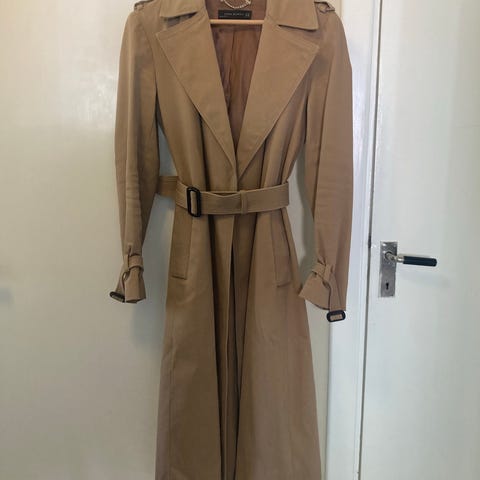 Zara kappa för dam i storlek M. Modellen är en längre kappa med dubbelknäppning framtill och avtagbart knytskärp i midjan. Kappan har axelklaffar, dekorativa knappar och slejf vid ärmslut. Passar som ytterplagg under vår och höst eller mildare vinterdagar beroende på lager under.