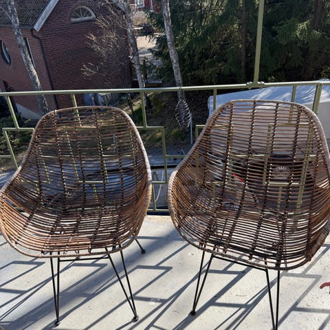 2 fåtöljer + ett bord med glasskiva. Material är rotting.