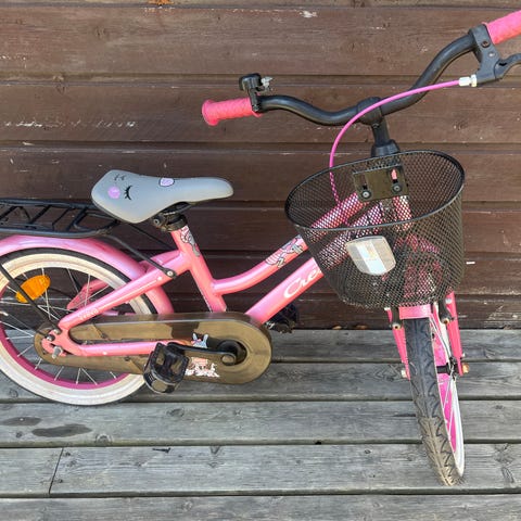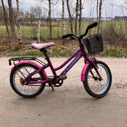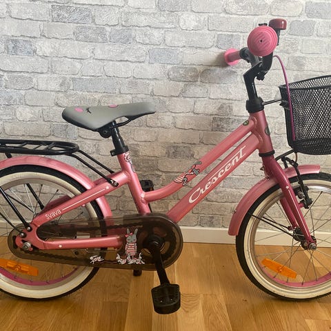 Crescent Svava barncykel med 16" hjul i rosa färg. Utrustad med korg fram, pakethållare bak, kedjeskydd och reflexer. Passar som första trampcykel för barn som är redo för 16-tums hjulstorlek.