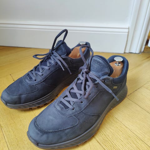Ecco sneakers med Gore-Tex i storlek 44. Skorna är bruna med snörning och har en ljus sula. Ovandelen verkar vara i mocka- eller nubukliknande material. Modellen är avsedd som vardags- eller promenadsko med vattentät och ventilerande Gore-Tex-membran. Passar för användning i varierande väderförhållanden.